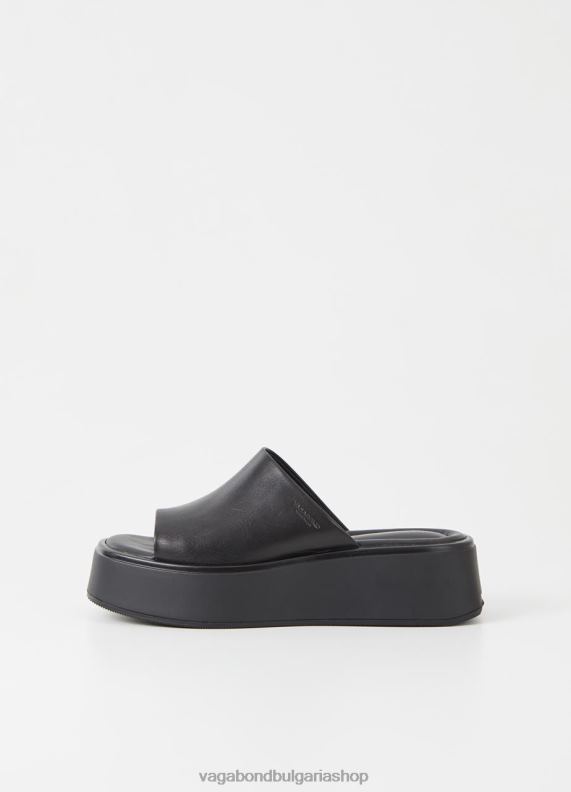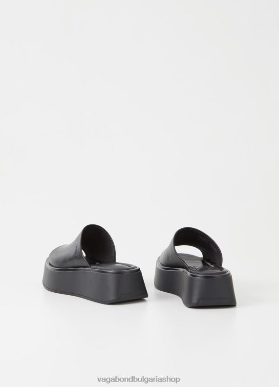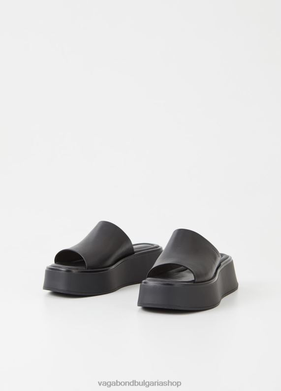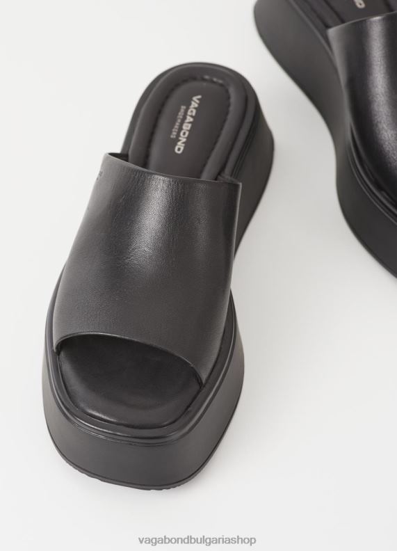 минималните сандали с приплъзване Courtney са изработени от гладка черна кожа с широка кожена каишка, подплатени стелки и квадратни пръсти. Горните комплекти на твърди подложки с плоски форми с размери 50 мм.