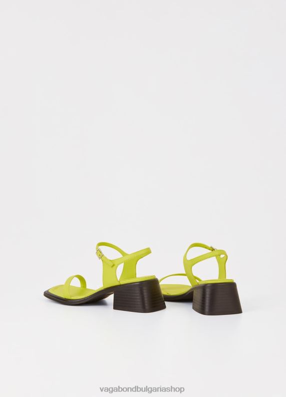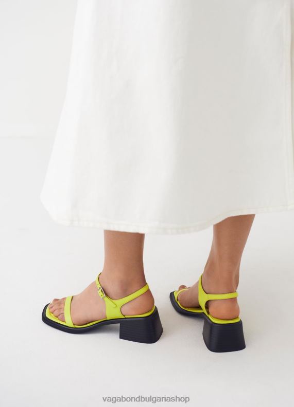 ines е сандали с ток с каишки с минималистичен вид. стилът е изработен от лайм-зелена кожа с квадратна форма на пръстите, минимална горна част и регулируема каишка с катарама. масивните токчета са с размери 53 mm.