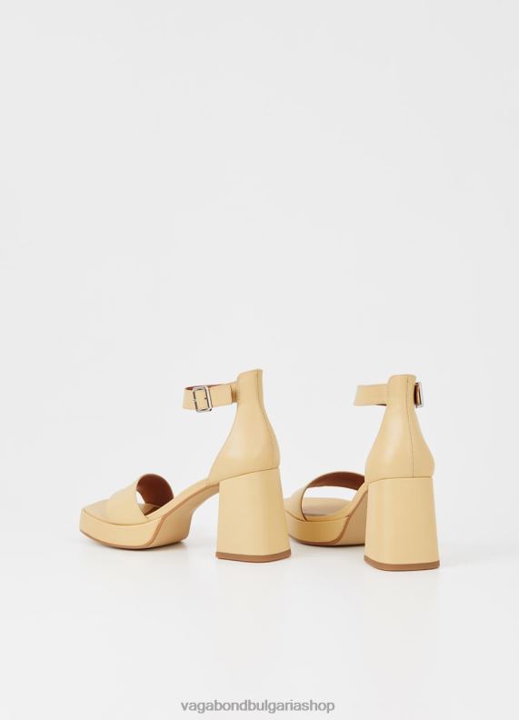 fiona са летните сандали на платформа с ретро вдъхновение. стилът е изработен от светложълта кожа с капачка със затворена пета, една каишка в горната част и регулируема каишка на глезена със закопчаване с катарама. твърдите платформени подметки са поставени на 85 мм блокови токчета.
